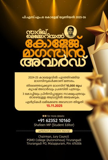 പി.എസ്.എം.ഒ കോളേജ് യൂണിയൻ സാദിഖ് മെമ്മോറിയൽ കോളേജ് മാഗസിൻ അവാർഡിന് മാഗസിനുകൾ ക്ഷണിച്ചു