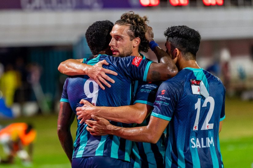 മത്സരത്തിൽ ഗോൾ നേടിയ കാലിക്കറ്റ് എഫ്.സി താരങ്ങളുടെ ആഹ്ലാദം.