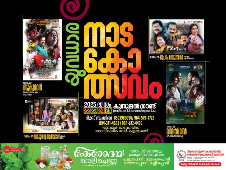 കക്കട്ടിൽ : യുവധാര കലാ കായിക സാംസ്കാരിക വേദി കുളങ്ങരത്ത്, പാലിയേറ്റീവ് പ്രവർത്തനങ്ങളുടെ ധനശേഖരണാർത്ഥം സംഘടിപ്പിക്കുന്ന നാടകോത്സവത്തിന് 2025 ഡിസംബർ 22ന് തുടക്കമാകും കുന്നുമ്മല് ശ്രീ ഭഗവതി ക്ഷേത്രത്തിന് സമീപമുള്ള ഗ്രൗണ്ടിൽ പ്രത്യേകം സജ്ജമാക്കിയ വേദിയിൽ 22ന് ആദ്യ നാടകമായ തിരുവനന്തപുരം നവോദയയുടെ സുകുമാരി അരങ്ങിലെത്തും.