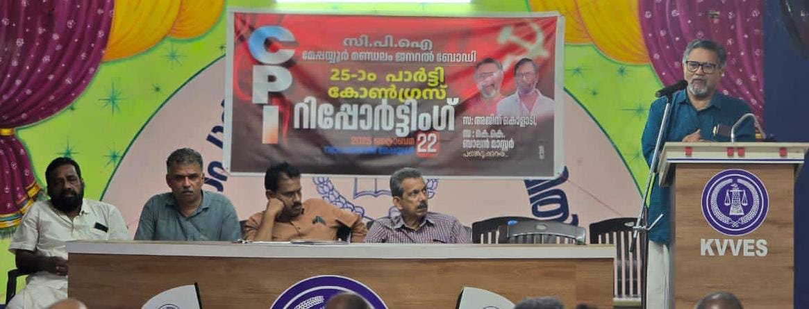 സി.പി.ഐ മേപ്പയ്യൂർ മണ്ഡലം ജനറൽബോഡിയിൽ പാർട്ടി കോൺഗ്രസ് തീരുമാനങ്ങൾ റിപ്പോർട്ട് ചെയ്തു സംസാരിക്കുകയായിരുന്നു അദ്ദേഹം.
