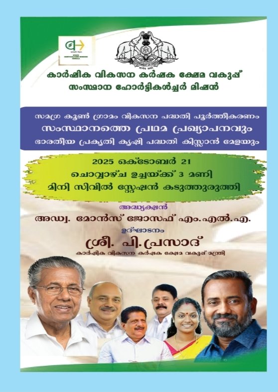 കൃഷി വകുപ്പ് മന്ത്രി പി.പ്രസാദ് ഉച്ചകഴിഞ്ഞ് 3:30ന് നിർവഹിക്കുന്നതാണ്.
