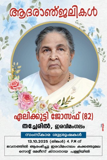 സംസ്കാരം തിങ്കളാഴ്ച നാല് മണിക്ക് കക്കത്തുമല സെയ്ന്റ് മേരീസ് ക്നാനായ കത്തോലിക്ക പള്ളിയിൽ.